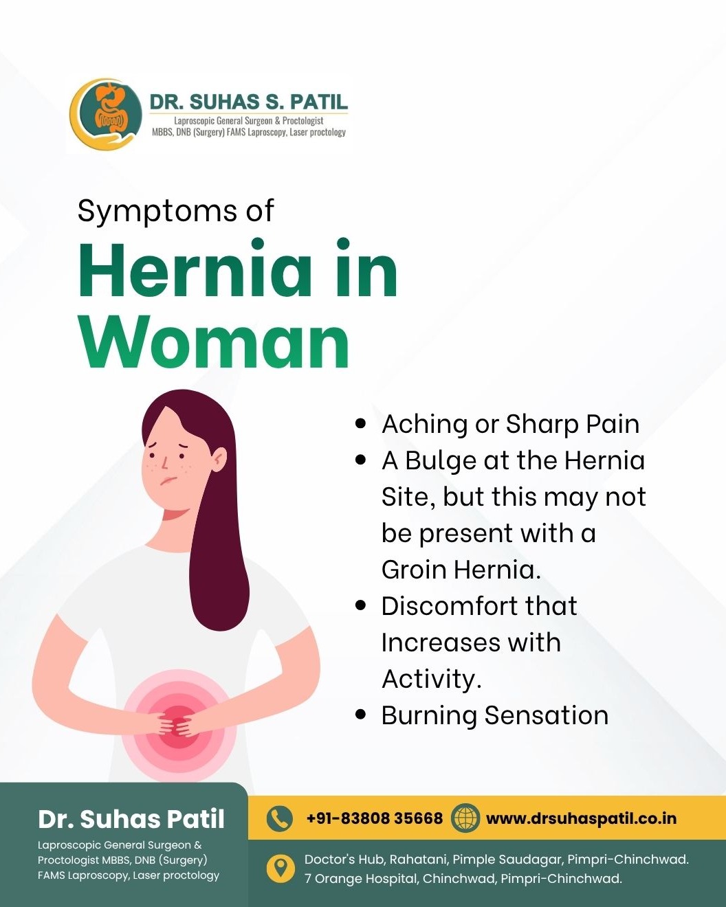 Symptoms of Hernia in Women Women with a hernia may experience aching or sharp pain, sometimes accompanied by a bulge at the hernia site, though this may not always be visible, especially with a groin hernia. Discomfort that increases with activity and a burning sensation are also common symptoms. Early recognition is crucial to prevent complications like strangulation or obstruction. If you notice persistent pain or swelling in the abdominal or groin area, don’t ignore it. Timely evaluation by a specialist can ensure proper hernia treatment, relieve discomfort, and restore daily activity safely. Consult for hernia treatment in PCMC and learn about hernia surgery cost in Pune. Meet the best surgeon for hernia in Pimple Chinchwad or try robotic hernia surgery in Akurdi. Our hernia doctor in Pune and hernia specialist in Pimple Saudagar provide advanced care for safe recovery.