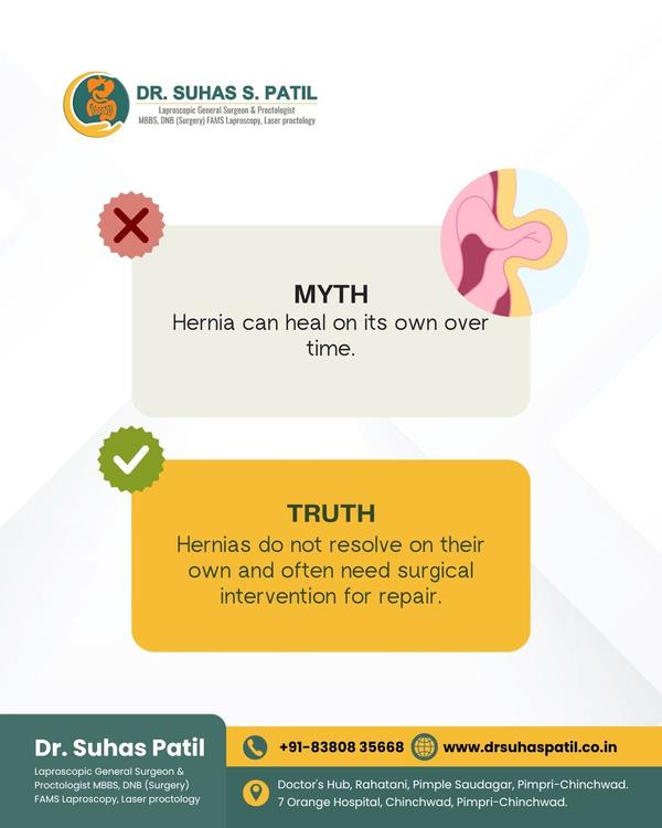 MYTH vs TRUTH Hernia MYTH: Hernia can heal on its own over time. TRUTH: Hernias do not resolve on th...